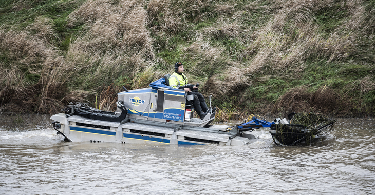 Aurajokisäätiö poistatti viime viikolla joesta keltalammikkia Östermalm Oy:n amfibiokoneella. Alumiininen, ketterä työkone sekä niittää että kerää, ja nousee vielä näppärästi jokipenkkaa ylös. Lammikki läjitettiin Vanhalinnan pelloille.